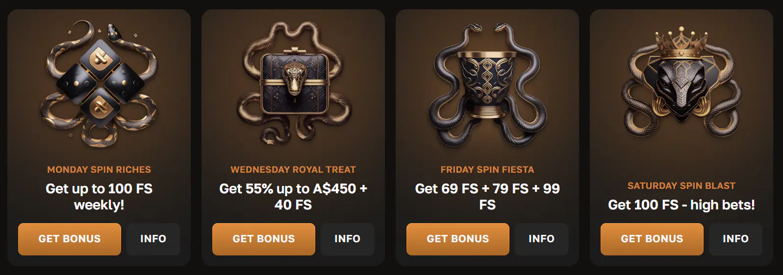 Minimum Deposit: tier-based from 60-105 AUD - Max Spins: depends on tier level: deposit 60-88.5 AUD with code ;FRI69 and get 69 Free Spins, 90-103.5 AUD with code ;FRI79 to get 79 Free Spins; 105 AUD with code ;FRI99 and receive 99 Free Spins.